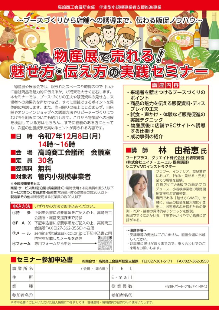 来る2025年12月8日(月)、高崎商工会議所様が主催する「物産展で売れる!魅せ方・伝え方の実践セミナー」にて、弊社代表の林 由希恵が講師を務めさせていただきます。