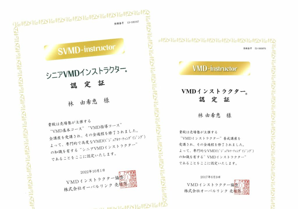 さまざまな職業に対応できる視覚的手法の原理原則と基礎を学び、お客様に効果的な商品の陳列・演出・表現を説明する際の言語化のノウハウを習得しました。都内で3日間の講義と試験を経て、VMDインストラクター協会認定の「VMDインストラクター」資格を取得することができました。